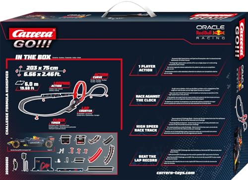 - CHALLENGING TRACK: With 6 metres of track length, the racetrack offers plenty of adrenaline. Steep curves, a spectacular fly-over, fast-paced looping and high-speed straight lines demand skill and precise timing on the hand controller