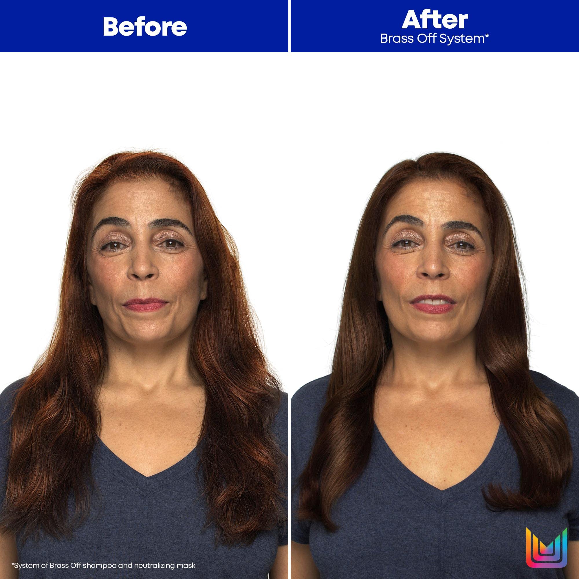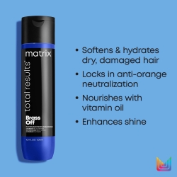 Tackle brassy tones once and protect from colour fade with Matrix Total Results Brass Off Blue Conditioner. Perfect for blondes and brunettes levels 5-7 Brass be gone – this impressive neutralling conditioner uses colour depositing formula to boost cool tones throughout the hair with 10X less breakage. The Matrix Total Results Brass Off Blue Conditioner protects coloured hair while injecting supreme shine for a sleek finish. Can be left on hair for 2-3 minutes for extra powerul toning effects. Try the Matrix Total Results Brass Off Brunette Blue Shampoo for additional neautralising benefits.